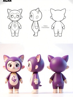 XGXR, Digital art of a cute, pudgy, plum and cream cartoon character, a small, round, magical animal with a teacup-shaped head, standing on two legs, wearing a cream saucer collar, and a plum steam pattern on its chest. The character has huge, expressive eyes and a small, pointed nose. The background is white with a faint horizontal gradient. The character is presented from three angles: front, side, and back. The front view displays the front and side, the side view reveals the side and back, and the back view shows the back and side. The character has a warm and tea-loving expression.