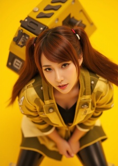 Masterpiece, Top quality, beautiful Korean woman, doll-like face, clean skin, neat honey-brown twintails, bright challenging grin, school jersey-style power suit, armored panels, active pose, giant high-tech warhammer, resting on shoulder, intensely saturated monochromatic citrine-yellow background, POV, high angle, face-focused close-up, looking up at viewer, massive warhammer head, visible behind her, framing face