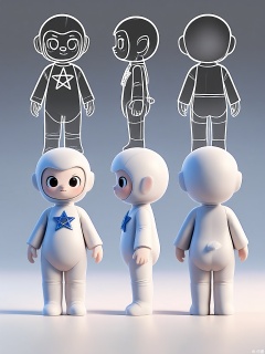 Digital rendering of an adorable, chubby, blue and silver cartoon character, a small humanoid creature with a spaceship-shaped head, standing firmly, wearing a silver helmet, and a blue star on its chest. The character has wide, curious eyes and a small, silver nose. The background is a plain white with a light sky-blue gradient. The character is shown from three perspectives: front, side, and back. The front view shows the front and a bit of the side, the side view presents the side and back, and the back view displays the back and a small part of the side. The character has an adventurous and excited look.