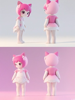 Digital artwork of a sweet, chubby, pink and white cartoon character, a small humanoid creature with a cupcake-shaped head, standing firmly, wearing a white frilly collar, and a pink cherry on top of its head. The character has wide, adoring eyes and a small, pink nose. The background is a plain white with a light baby-pink gradient. The character is shown from three perspectives: front, side, and back. The front view shows the front and a bit of the side, the side view presents the side and back, and the back view displays the back and a small part of the side. The character has a delicious and inviting smile.