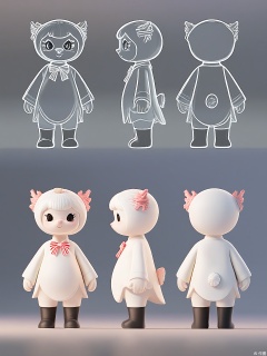 XGXR, Digital art of a charming, plump, coral and mint cartoon character, a tiny, round, imaginary creature with a seashell-shaped head, standing on two little legs, sporting a mint striped bow tie, and a coral pearl on its chest. The character has large, sparkling eyes and a tiny, triangular nose. The background is a plain white with a light diagonal gradient. The character is depicted from three views: front, side, and back. The front view presents the character's front and side, the side view displays the character's side and back, and the back view reveals the character's back and side. The character has a playful and welcoming expression.