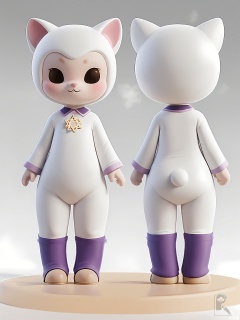 XGXR, Digital art of a cute, pudgy, plum and cream cartoon character, a small, round, magical animal with a teacup-shaped head, standing on two legs, wearing a cream saucer collar, and a plum steam pattern on its chest. The character has huge, expressive eyes and a small, pointed nose. The background is white with a faint horizontal gradient. The character is presented from three angles: front, side, and back. The front view displays the front and side, the side view reveals the side and back, and the back view shows the back and side. The character has a warm and tea-loving expression.
