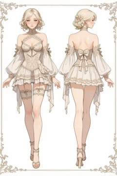 The bodice of the top is decorated with a large bow at the neckline, and the skirt is also decorated with lace. The woman has blonde hair styled in loose curls and is wearing high heels