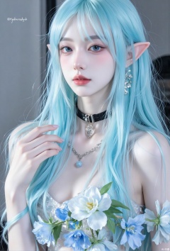 1girl, solo, long hair, looking at viewer, bangs, blue eyes, bare shoulders, jewelry, closed mouth, blue hair, upper body, flower, choker, pointy ears, necklace, lips, aqua hair, watermark, elf, portrait, blue flower, realistic