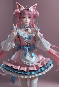 (score_9),<lora:小狸-Apony:0.85>,xiaohuli,solo,animal ear fluff,fox ears,double bun,long hair,twintails,pink hair,ahoge,hairband,earrings_ring,lipstick,choker,neck bell,frills,jewelry,earrings,maid dress,bow,belt,blue sash,thighhighs,white thighhighs,standing,<lora:perfect-eyes:0.8>,pink eyes,double v,fingernails,(pink_nails:1.1),(mature_female:1.1),mature,collarbone,<lora:e色温:0.5>,(white_skin),(fair_skin),<lora:e肤色滑块:0.5>,front view,light blush, simple background,(huge filesize:1.1),(wallpaper:1.1),(game cg:1.1),rim light,pink background,<lora:Expressive_H:0.8>,<lora:detailed_notrigger:1>,<lora:皮肤凹痕:1.2>,<lora:身材滑块:1>,