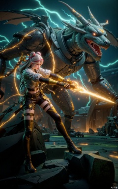 1 girl, solo, full body covered with golden nano armor, hair tips converted into data links, pupil projection combat power value (ATK 9999), suspended in the ruins of broken game servers, energy torrent, huge mechanical three-headed dragon mech as background.