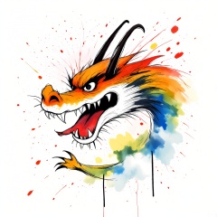 PMSC, A majestic, Chinese ink-wash watercolor of a dragon soaring through the clouds, with a gold and red color palette highlighted by touches of blue and green. The dragon's scales and claws are portrayed with bold, powerful brushstrokes, conveying its mythical and awe-inspiring nature. The white background emphasizes the dragon's dominance in the sky, creating a dramatic and dynamic composition.