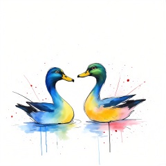 PMSC, A charming, Chinese ink-wash watercolor of a pair of mandarin ducks swimming on a tranquil pond, in a soft blue and green color scheme with touches of pink and yellow. The ducks' feathers are portrayed with gentle, curving lines, reflecting their grace and harmony. The simple white background enhances the serenity of the scene, evoking a sense of peace and love.