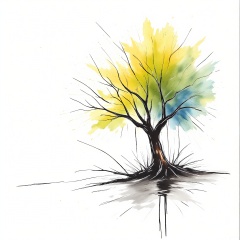 PMSC, A serene, Chinese ink-wash watercolor of a willow tree by a riverbank, with a soft green and brown color scheme complemented by subtle white highlights. The willow branches are rendered with gentle, flowing lines, symbolizing flexibility and grace. The white background enhances the tranquility of the scene, creating a peaceful and relaxing composition.