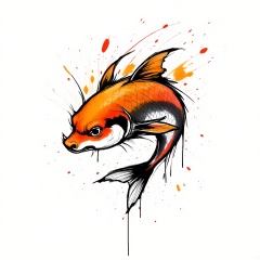 PMSC, A lively, Chinese ink-wash watercolor painting of a koi fish leaping out of water, featuring a vibrant orange and white color palette with bold black accents. The fish's scales are depicted with dynamic, energetic brushwork, showcasing its vitality and strength. The white background provides a clean contrast, making the koi fish the center of attention in this spirited composition.