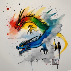 PMSC, A majestic, Chinese ink-wash watercolor of a dragon soaring through the clouds, with a gold and red color palette highlighted by touches of blue and green. The dragon's scales and claws are portrayed with bold, powerful brushstrokes, conveying its mythical and awe-inspiring nature. The white background emphasizes the dragon's dominance in the sky, creating a dramatic and dynamic composition.
