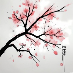 PMSC, A delicate, Chinese ink-wash watercolor of a cherry blossom branch in spring, in a soft pink and white color scheme with subtle green accents. The cherry blossoms are rendered with gentle, blooming strokes, symbolizing beauty and renewal. The white background highlights the branch's elegance and fragility, creating a serene and romantic scene.