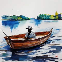 PMSC, A tranquil, Chinese ink-wash watercolor of a fisherman rowing a boat on a calm lake at dawn, with a soft blue and gray color scheme complemented by subtle white highlights. The fisherman's silhouette and the boat are depicted with simple, confident lines, while the lake and sky are rendered with gentle, flowing strokes. The white background enhances the sense of peace and solitude, creating a meditative and contemplative atmosphere.