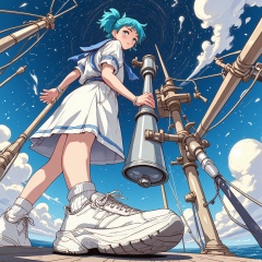 Wide-angle perspective, DTS, A dynamic, low-angle illustration of a character with turquoise hair in a high ponytail, wearing a white and blue sailor uniform, a scarf, and white sneakers. The character is holding a telescope, looking through it towards the viewer as if exploring the stars. The background features a ship's deck with ropes, sails, and a vast, starry sky with constellations. The style is reminiscent of a comic book or graphic novel, with clean, nautical lines and a bright, ocean-inspired color scheme.