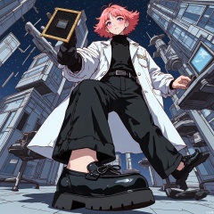Wide-angle perspective, DTS, A dynamic, low-angle illustration of a character with coral-pink hair in a pixie cut, wearing a white lab coat over a black turtleneck, black pants, and black loafers. The character is holding a microchip, examining it closely as they look towards the viewer. The background features a high-tech office with sleek desks, computers, and a large window overlooking a futuristic cityscape at night. The style is reminiscent of a comic book or graphic novel, with sharp, angular lines and a sleek, modern color scheme.