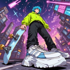 DTS, A dynamic, low-angle illustration of a character with electric-blue hair, wearing a neon-green hoodie, black skinny jeans, and chunky white sneakers. The character is clutching a glowing skateboard, ready to launch off a ramp towards the viewer. The background showcases a sprawling cityscape with neon signs, billboards, and a twilight sky painted in shades of purple and pink, with streaks of light that could be fireworks or energy beams. The style is reminiscent of a comic book or graphic novel, with bold lines and vibrant, electric colors.