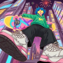 DTS, A dynamic, low-angle illustration of a character with electric-blue hair, wearing a neon-green hoodie, black skinny jeans, and chunky white sneakers. The character is clutching a glowing skateboard, ready to launch off a ramp towards the viewer. The background showcases a sprawling cityscape with neon signs, billboards, and a twilight sky painted in shades of purple and pink, with streaks of light that could be fireworks or energy beams. The style is reminiscent of a comic book or graphic novel, with bold lines and vibrant, electric colors.
