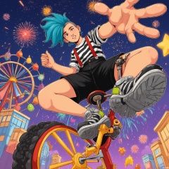 Wide-angle perspective, DTS, A dynamic, low-angle illustration of a character with teal hair in a mohawk, wearing a black and white striped shirt, red suspenders, and black shorts. The character is balancing on a unicycle, one hand holding the handlebars and the other waving towards the viewer. The background depicts a lively carnival with Ferris wheels, roller coasters, and a starry night sky filled with fireworks. The style is reminiscent of a comic book or graphic novel, with bold, playful lines and a bright, carnival-inspired color palette.