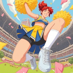 Wide-angle perspective, DTS, A dynamic, low-angle illustration of a character with coral-red hair in a high ponytail, wearing a white and gold cheerleading uniform with pom-poms, and knee-high white socks. The character is jumping in the air, one leg extended towards the viewer with a big, enthusiastic smile. The background features a high school football stadium with crowds of fans, a scoreboard, and a bright, sunny sky. The style is reminiscent of a comic book or graphic novel, with lively, energetic lines and a bright, cheerleading-inspired color scheme.