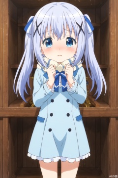 1girl, solo, long hair, blue eyes, long sleeves,  blue hair, standing, parted lips, hairclip, scarf, blurry, coat, buttons, x hair ornament, white scarf, double-breasted, light blue hair, blue coat,, kafuu chino,embarrassed , blush, shy,  , (tear:1.3),(nose blush:1.5),twintails,Hair accessories,single stripe ribbons,