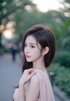 This is a high-resolution photograph featuring an Asian woman with a delicate,ethereal appearance. She has smooth,fair skin,large,almond-shaped eyes with a subtle makeup look,and full,pink lips. Her dark,straight hair cascades in soft waves,framing her face. She wears a strapless,pale pink dress with a fitted bodice,and a sheer,flowing pink fabric draped over her shoulders,adding a touch of elegance. Her jewelry includes small,sparkling stud earrings and a delicate bracelet on her left wrist. The background is a blurred,bokeh effect,suggesting a serene outdoor setting,possibly a garden or park,with lush greenery and a hint of a sunset or early morning light,creating a dreamy atmosphere. The overall composition and lighting emphasize the subject's delicate beauty and the serene,romantic ambiance of the scene.,<lora:3e752b:0.75>,
