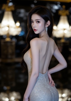The photograph captures a young Asian woman with a delicate,porcelain-like complexion and long,wavy dark brown hair cascading over her shoulders. She has large,expressive eyes with a subtle smoky eye makeup,and her lips are painted a soft pink. She is wearing a form-fitting,sleeveless,silver sequin dress that hugs her slender physique,highlighting her small to medium-sized breasts. Her dress has a plunging back,revealing her bare shoulders and back. She accessorizes with a pair of elegant,dangling earrings adorned with small,sparkling crystals. The background is blurred,featuring a luxurious setting with golden chandeliers and a dark,reflective surface,possibly a pool or a mirror,that reflects the chandeliers and creates a shimmering effect. The lighting is soft and diffused,enhancing the ethereal quality of the scene. The overall aesthetic is glamorous and elegant,emphasizing the subject's beauty and the opulent environment,<lora:3e752b:0.75>,