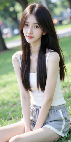 The image shows a young woman sitting on the grass in a park. She is wearing a white sleeveless top and light gray shorts with white trim, and her long straight hair cascades over her shoulders. The background is blurred by shallow depth of field, with hints of greenery and possibly buildings or structures in the distance. The lighting is soft and natural, creating a serene and pleasant atmosphere in the scene.