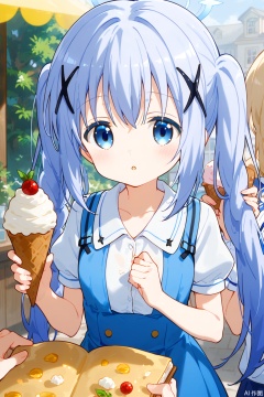 1girl, solo, long hair, blush, bangs, blue eyes, skirt, shirt, hair ornament, dress, holding, hair between eyes, twintails, blue hair, collarbone, white shirt, braid, short sleeves, sidelocks, outdoors, parted lips, food, solo focus, puffy sleeves, collared shirt, :o, twin braids, puffy short sleeves, blue skirt, book, alternate hairstyle, buttons, blue dress, x hair ornament, ice cream, light blue hair, kafuu chino
