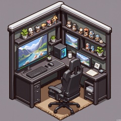 XXDJ, A detailed, stylized digital drawing of a modern gaming den corner, featuring a minimalist glass desk with a high-performance gaming PC, a gaming chair with RGB lighting, and a shelf displaying collectible gaming figurines. The background includes a wall-mounted TV showing a live game stream. The overall aesthetic is sleek and high-tech.