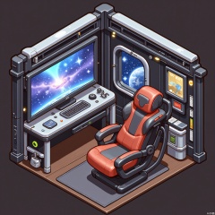 XXDJ, A detailed, stylized digital drawing of a futuristic space-themed gaming corner, featuring a zero-gravity gaming chair, a holographic game console, and a wall display showing a starry galaxy. The background includes a view of a spaceship cockpit through a virtual window. The overall aesthetic is otherworldly and thrilling.