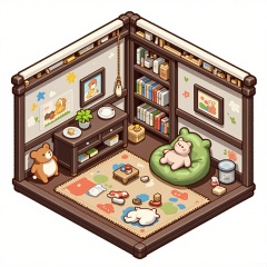 XXDJ, A detailed, stylized digital drawing of a cozy children's game room corner, featuring a low table with a colorful playmat, a set of wooden blocks and toys, and a beanbag chair shaped like a friendly animal. The background includes a wall decorated with cartoon characters and a bookshelf filled with children's books. The overall aesthetic is playful and inviting.