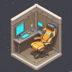 XXDJ, A detailed, stylized digital drawing of a futuristic space-themed gaming corner, featuring a zero-gravity gaming chair, a holographic game console, and a wall display showing a starry galaxy. The background includes a view of a spaceship cockpit through a virtual window. The overall aesthetic is otherworldly and thrilling.