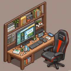XXDJ, A detailed, stylized digital drawing of a modern gaming den corner, featuring a minimalist glass desk with a high-performance gaming PC, a gaming chair with RGB lighting, and a shelf displaying collectible gaming figurines. The background includes a wall-mounted TV showing a live game stream. The overall aesthetic is sleek and high-tech.