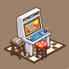 XXDJ, A detailed, stylized digital drawing of a retro arcade gaming corner, featuring a classic arcade cabinet with a brightly lit screen, a stool with a checkered seat, and a wall covered in vintage arcade posters. The background includes a neon sign flickering with the words "Game On." The overall aesthetic is nostalgic and energetic.