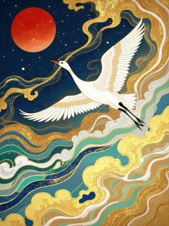 jbch, A vibrant, digital art illustration features a majestic white crane with black wings soaring over swirling, golden waves against a backdrop of a deep blue sky and a radiant red sun. The waves, detailed with shades of turquoise and gold, create a dynamic, fluid motion. The scene is rich in texture and color, evoking a sense of tranquility and freedom. <lora:S-T-岩彩国风_S1.5:1>