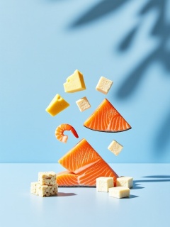 STML, Photograph of vibrant, colorful food elements against a light blue background. The image features a floating slice of salmon, a shrimp, a wedge of cheese, cubes of cream cheese, and assorted cubes of tofu and crackers. Shadows of palm leaves are cast on the right. The scene is bright and minimalist, emphasizing the freshness and variety of the foods.<lora:S-T-猫粮海报_S1.5:1>