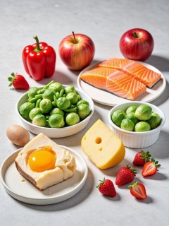 STML,a photograph showcasing a variety of fresh food items on a light grey countertop. Items include vibrant red bell peppers, a red apple, two salmon fillets, a steak, a plate of green beans, a bowl of Brussels sprouts, a plate of strawberries, and a wedge of cheese. The food is arranged neatly, emphasizing freshness and diversity.<lora:S-T-猫粮海报_S1.5:1>