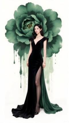 This illustration skillfully fuses fashion and art. The woman in an exquisitely tailored black gown stands elegantly. The high slit, black stockings and high - heels outline a sexy charm. The splashed - ink green flowers in the background are free and unrestrained. The collision of traditional ink painting and modern fashion creates a unique and artistic visual experience.