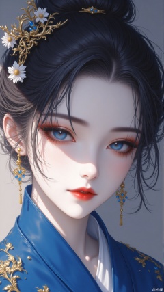 1girl, solo, looking at viewer, blue eyes, black hair, hair ornament, jewelry, closed mouth, upper body, flower, earrings, hair flower, hair bun, makeup, chinese clothes, sunlight, single hair bun, portrait, red lips