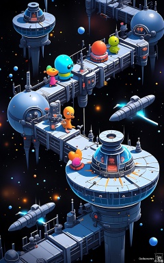SBYX, An overhead view of a lively, cartoonish, fantasy space colony. Dome-shaped buildings made of metal and glass float in the void of space, connected by transparent tubes. Spaceships dock at the colony's ports, and aliens of all shapes and sizes go about their daily lives. The stars twinkle in the blackness, and the colony is bathed in a soft, blue light.
