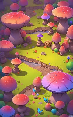 SBYX, An aerial view of a whimsical, cartoon-style, fantasy mushroom forest. Giant mushrooms of all shapes and sizes tower over the forest floor, and fairies flit among them. A small stream winds through the forest, and butterflies with colorful wings dance in the air. The scene is bathed in a soft, pink light.