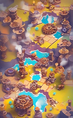 SBYX, A vertical perspective of a charming, cartoonish, fantasy clockwork city. Gears and cogs turn in the walls and buildings, and steam rises from the chimneys. Airships float in the sky, and robots go about their tasks. The city is a maze of metal and glass, and the air is filled with the sound of clanking and hissing.
