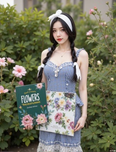 The image shows a person standing outdoors in a garden setting. They are wearing a blue and white checkered dress with lace trim at the hem and sleeves. The person has two braids, each tied with a white headband. They are holding a book titled "FLOWERS" with a subtitle that reads "The Art of Plant Propagation." The book cover is green with white and yellow text. The background is lush and green, with various plants and flowers, creating a serene and natural atmosphere.