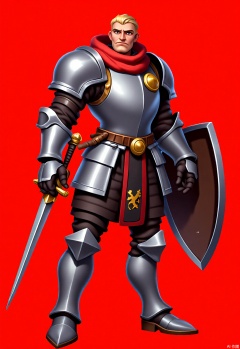 KTJS, Digital illustration of a male knight in shining armor, standing tall with his sword drawn. He has short, blond hair and a stern expression, with intense gray eyes. His armor is adorned with intricate engravings and a red cape billows behind him. He wears leather gloves and knee-high boots, and a shield with a lion crest is strapped to his back. The background is a bold, bright red.