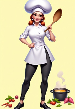KTJS, Digital illustration of a female chef in a white chef's hat and apron, holding a large wooden spoon. She has long, red hair tied in a bun and a cheerful smile, with warm brown eyes. She wears a white shirt with black pants and black shoes. Ingredients like vegetables and spices are scattered around her, and a pot of soup bubbles on the stove behind her. The background is a creamy, off-white.