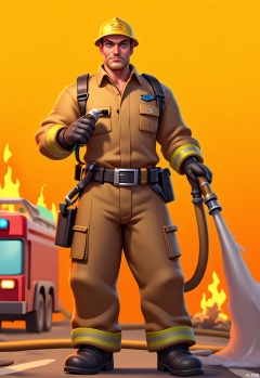 KTJS, Digital illustration of a male firefighter in full gear, holding a hose and spraying water on a fire. He has a determined look on his face, with short, blond hair and bright blue eyes. He wears a yellow helmet, a jacket, and boots. A fire truck is in the background, and flames rage around him. The background is a bright, fiery orange.