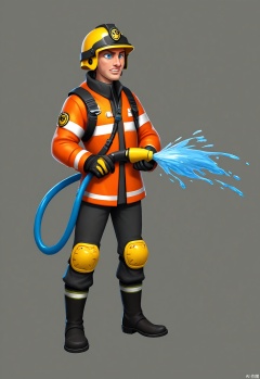 KTJS, Digital illustration of a male firefighter in full gear, holding a hose and spraying water on a fire. He has a determined look on his face, with short, blond hair and bright blue eyes. He wears a yellow helmet, a jacket, and boots. A fire truck is in the background, and flames rage around him. The background is a bright, fiery orange.