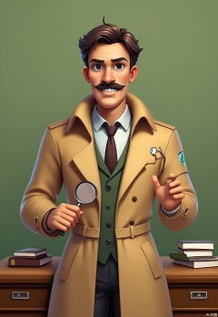 KTJS, Digital illustration of a male detective with a mustache and a trench coat, holding a magnifying glass. He has short, graying hair and a thoughtful expression, with deep brown eyes. He wears a suit and tie, and a badge is pinned to his coat. A pipe is clenched between his teeth, and a stack of files is on the desk beside him. The background is a muted, olive green.