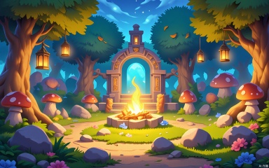 A whimsical digital illustration of an enchanted forest clearing in a cartoon style, bathed in golden twilight filtering through bioluminescent trees. The glen features a moss-covered stone altar, a glowing crystal pond, and twisted mushroom benches. A circle of ancient runestones surrounds a campfire, with floating lanterns and animal totems. The air shimmers with magical particles, creating an aura of mystical discovery.