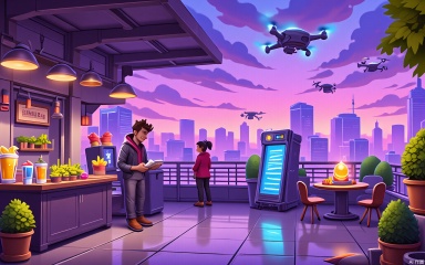 A dynamic digital rendering of a futuristic city rooftop garden in cartoon style, under neon-purple dusk. Hydroponic planters burst with glowing flora between solar-panel awnings. A hover-cart vendor sells neon smoothies beside a holographic chess table. Potted bonsai trees and floating drones complete the cyber-serene atmosphere.
